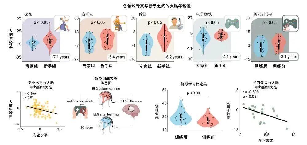 在腦科學(xué)領(lǐng)域有一個(gè)名詞,叫做腦鐘(Brain clocks),指的是根據(jù)大腦活動(dòng)模式計(jì)算出的大腦年齡,而它與我們的實(shí)際年齡之間的差值,就叫做大腦年齡差(Brain age gaps),如果它大于 0,就說(shuō)明大腦年齡比自己的實(shí)際年齡要更老,這就是為什么很多人會(huì)覺(jué)得自己明明還不老,但是腦子卻變得越來(lái)越不好使了。那有什么辦法能夠延緩大腦的衰老呢?一個(gè)很好的辦法就是:堅(jiān)持投入到一件能發(fā)揮創(chuàng)造性的愛(ài)好中。一項(xiàng)今年發(fā)表的最新腦科學(xué)研究做了一個(gè)這樣的實(shí)驗(yàn),研究者招募了 232 名參與者,其中有擅長(zhǎng)某個(gè)創(chuàng)造性領(lǐng)域的專家,包括探戈、音樂(lè)、繪畫(huà)和電子游戲四類,也有只是略懂該領(lǐng)域的新手,研究者通過(guò) AI 算法和腦電波數(shù)據(jù),分別計(jì)算了專家組和新手組的大腦年齡差。接著,研究者另外找了一群不會(huì)玩電子游戲的新手,讓他們接受 30 小時(shí)的游戲訓(xùn)練,看看他們?cè)诙唐谟?xùn)練后是否會(huì)讓大腦變得更年輕。結(jié)果發(fā)現(xiàn),專家組的大腦年齡比新手組的人平均年輕了大約 5.5 歲,即使是經(jīng)過(guò)了 30 小時(shí)短期訓(xùn)練的新手,他們的大腦年齡也比訓(xùn)練前年輕了大約 3.06 歲。而且,研究者還發(fā)現(xiàn),這種延緩衰老的效果是按“劑量”生效的,意思是說(shuō),一個(gè)人在某個(gè)領(lǐng)域練習(xí)越長(zhǎng)時(shí)間,大腦就會(huì)越年輕。[1]