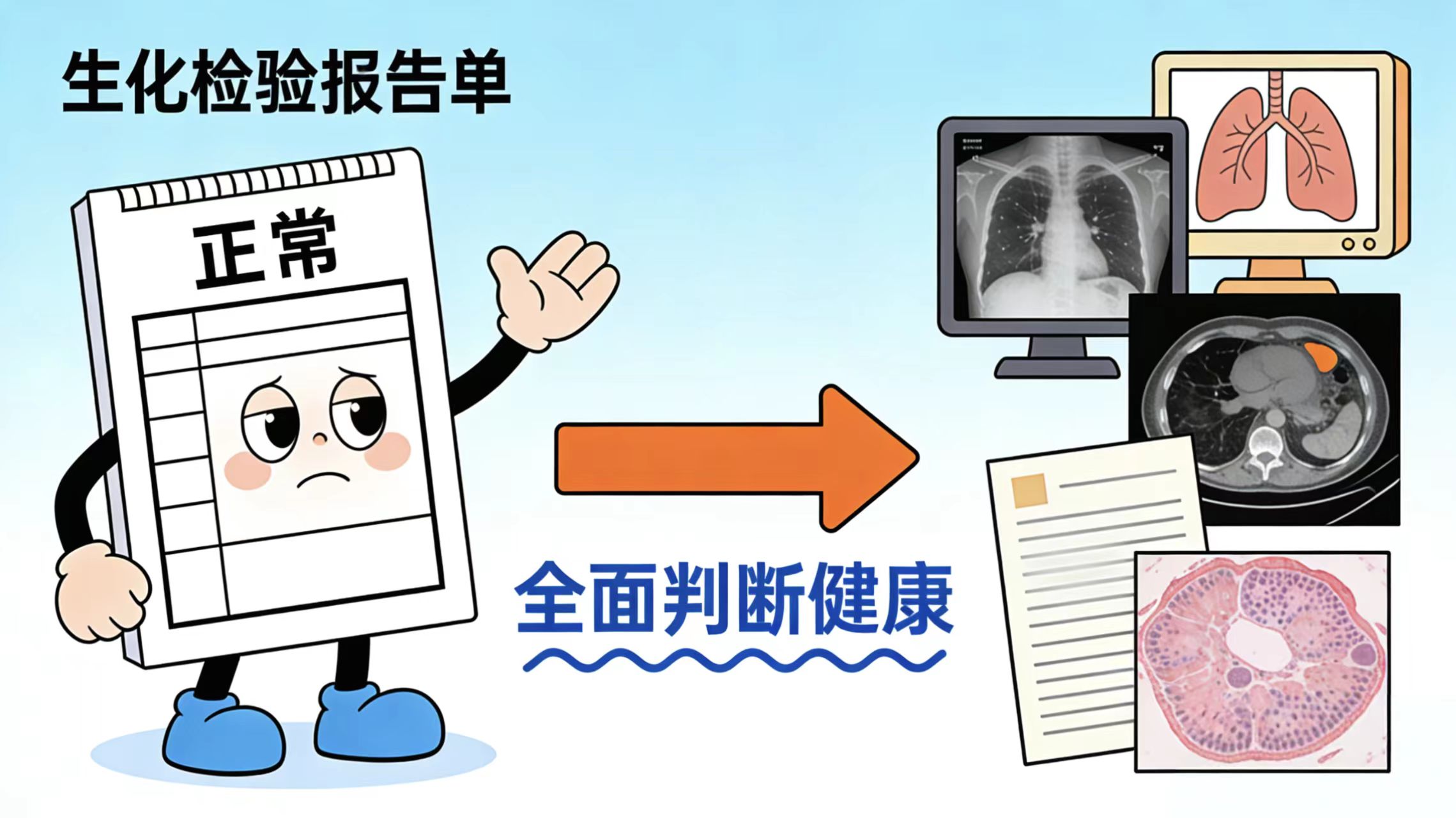 所以,別把我的“正?!碑敵山^對的健康信號。我的使命是幫你排查“已出現(xiàn)生化異常的疾病”,但那些“還沒影響生化指標的早期病變”“非化學性損傷(如血管、骨骼、神經(jīng)病變)”,還需要結合其他檢查——比如影像學檢查、病理活檢、腫瘤標志物檢測等,才能全面判斷。