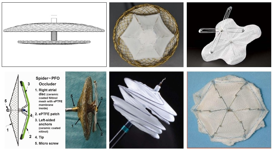 圖6所示為典型的PFO介入封堵器。其外形結(jié)構(gòu)像雨傘。之所以做成傘狀,是為了在經(jīng)導(dǎo)管輸送封堵器時(shí)將封堵器壓握在鞘管內(nèi),當(dāng)封堵器被輸送到卵圓孔位置從鞘管中釋放出來(lái)后,“傘”狀結(jié)構(gòu)跨越卵圓孔兩側(cè)張開,再用力牽拉并擰緊中間螺紋鎖緊兩側(cè)腹膜支架結(jié)構(gòu),即可將封堵器錨定在卵圓孔處,從而將卵圓孔阻斷。說(shuō)直白一點(diǎn),PFO封堵器就像一個(gè)鉚釘,將卵圓瓣與房間隔緊緊鉚接在一起(圖5)。