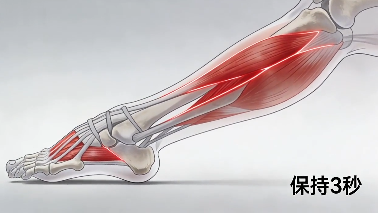 (2)放松還原:緩慢放松腳尖,恢復(fù)中立位,休息3-5秒;可搭配繃腳動(dòng)作(腳尖向下踩,繃緊小腿后側(cè)肌肉)交替進(jìn)行,增強(qiáng)鍛煉效果。