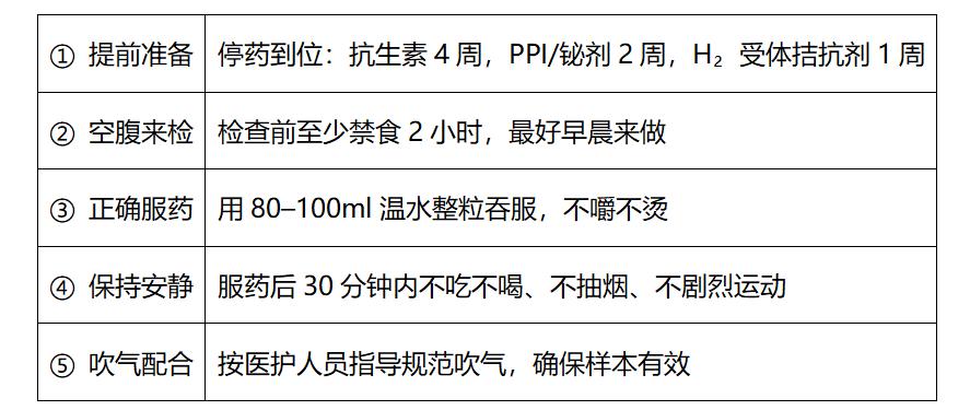 · 剛吃過這些藥的:抗生素(阿莫西林等)得停4周,奧美拉唑等PPI停2周,鉍劑(枸櫞酸鉍鉀)停2周,西咪替丁等H?受體拮抗劑停1周。因為這些藥會“殺死”或“抑制”幽門螺桿菌,導(dǎo)致結(jié)果不準。