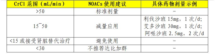 依據(jù)相關(guān)指南,下面的表格匯總了腎功能與NOACs用量建議