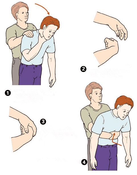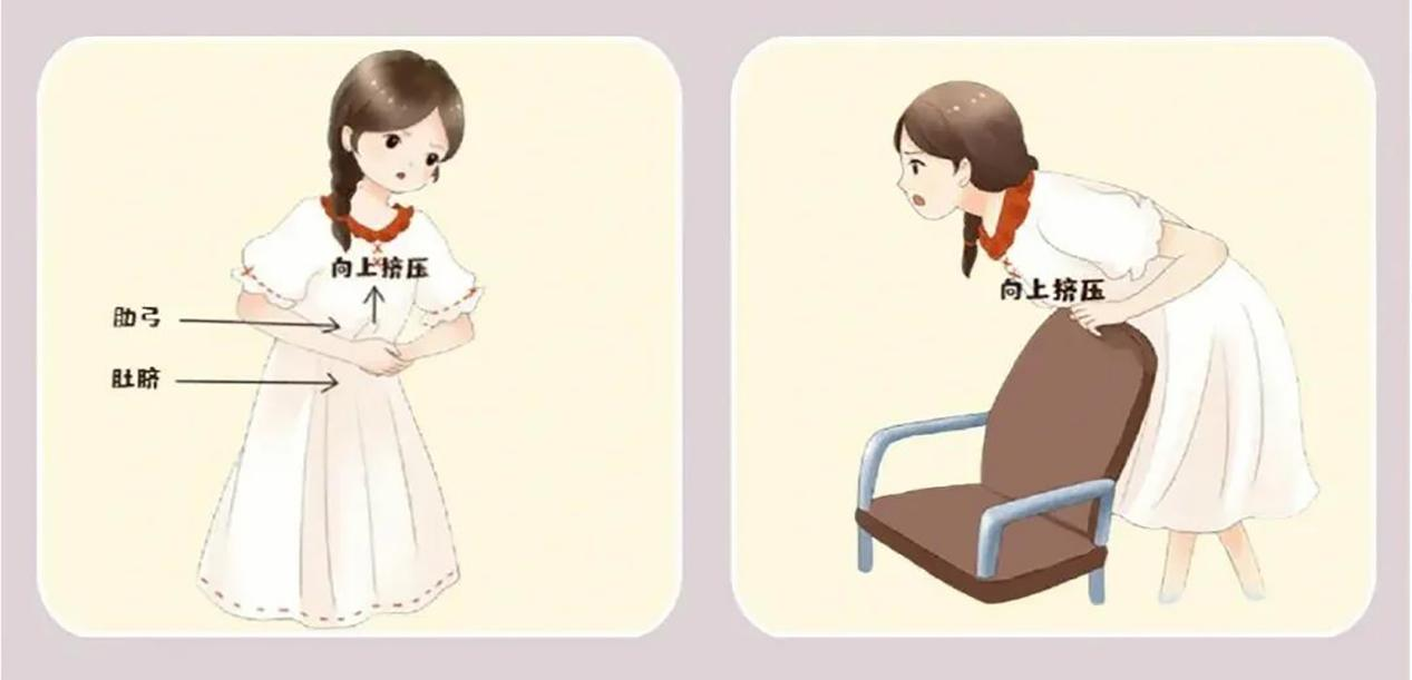 一手握拳,拇指頂住上腹部,另一手抓住握拳手,急速且有力地向內(nèi)、向上沖擊,可借助椅背、桌角、欄桿等堅(jiān)硬物體,將上腹部頂壓于物體邊緣,快速向上沖擊;直至異物排除。