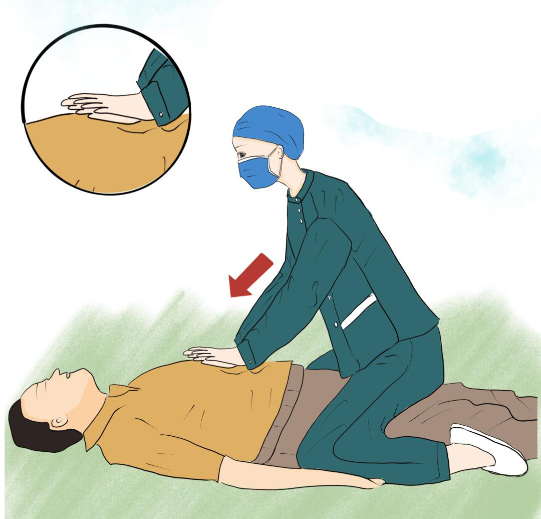 立即扶其平臥于堅(jiān)實(shí)地面,施救者騎跨于患者大腿兩側(cè),手掌根置于肚臍上方兩橫指處、劍突下方,另一手重疊其上,迅速有力地向下、向前沖擊上腹部。之后檢查口腔,如見異物則用手指鉤出(注意勿推入更深)。每5次沖擊后評估呼吸與意識,循環(huán)操作直至醫(yī)護(hù)人員到達(dá)。