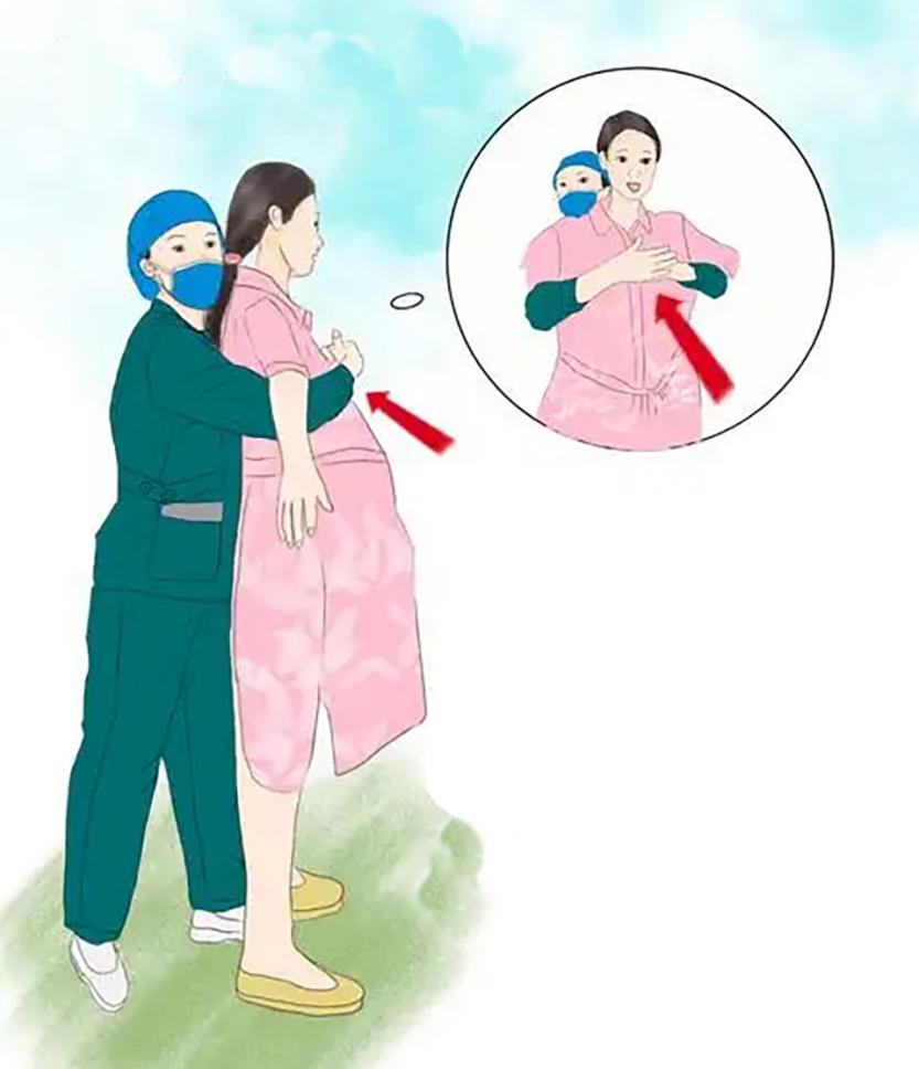 孕婦不宜使用腹部沖擊法,應(yīng)改為胸部沖擊法。兩手環(huán)繞患者的胸部,一手握空心拳貼在兩乳連線中間,另一手抓住拳頭,垂直向內(nèi)做胸部按壓,直到氣道阻塞解除。