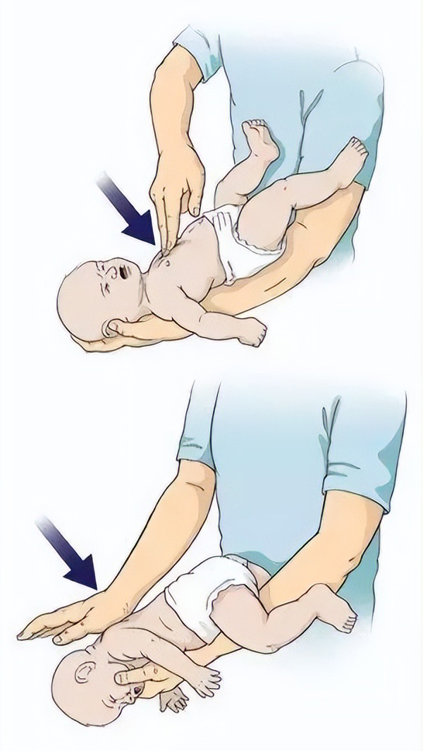 絕對不可使用成人手法,1歲的嬰兒,氣道異物阻塞時會面色發(fā)紺、無法哭喊、呼吸困難,應(yīng)將嬰兒面朝下,使其身體依靠在手臂上,頭部略低于身體,用手支撐嬰兒頭部和頸部,用另一只手的掌根在嬰兒背部兩肩胛骨之間快速有力地拍擊5次,若無效,將嬰兒翻轉(zhuǎn)成面朝上,放在手臂上,在兩乳頭連線中點(diǎn),用兩根手指快速、有力地向下按壓5次,重復(fù)操作,直至異物排出,切記不能將嬰兒雙腳抓起倒吊從背部拍打。