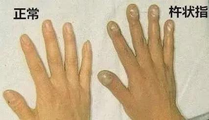 05杵狀指。杵狀指是手指外形類似木杵,寬厚粗大。肺臟是非常嬌弱的器官,早期肺部腫瘤容易破裂,其中的化學(xué)物質(zhì)釋放到血液循環(huán)系統(tǒng)中,手指關(guān)節(jié)受到這些物質(zhì)的刺激而變寬、變厚,就會(huì)形成杵狀指。