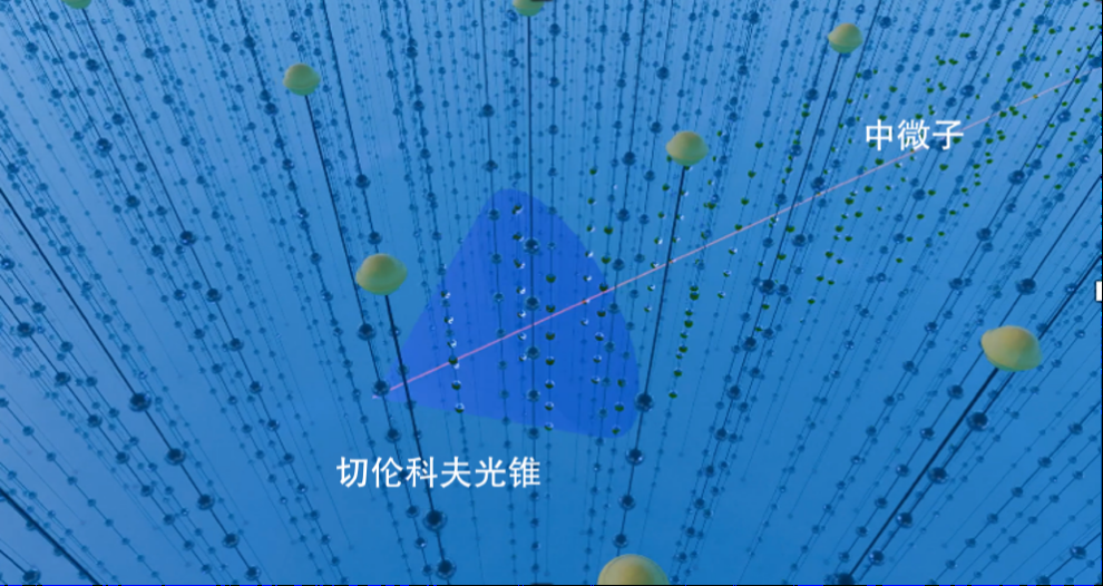 當(dāng)能量很大的中微子擊中到水中的物質(zhì)時,就會將自己的能量轉(zhuǎn)移給帶電粒子。這些帶電粒子在水中的速度就超過了光在水中的速度(光在水中的傳播速度只有真空中的大約75%),從而發(fā)出一種夢幻般藍(lán)色的輝光,也就是所謂的切倫科夫光。就好像一架飛機(jī)在空氣中飛行,當(dāng)它的速度超過聲音在空氣中的速度時,會產(chǎn)生音爆一樣。