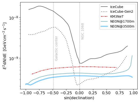 我們當(dāng)前的研究表明,如果在中國南海的建設(shè)10立方公里的中微子望遠(yuǎn)鏡——百川,我們將對高能中微子具有極佳的靈敏度,可以把鉀元素的輻射進(jìn)行很好的排除,同時作為靠近赤道的探測實驗,對全天的中微子都具有較好的探測效率,將在國際上處于領(lǐng)先地位(如圖3所示)。